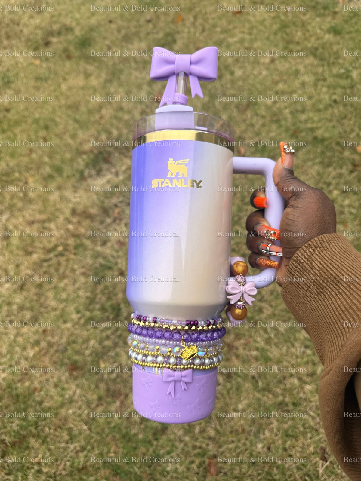 Add a touch of sparkle to your Stanley with this 8-piece purple and gold bracelet stack, perfectly inspired by the Glinda for Good cup. Each bracelet is handmade with love, featuring a mix of lavender, gold, and pearl beads with elegant details like crown charms and bows that give your tumbler a truly royal look